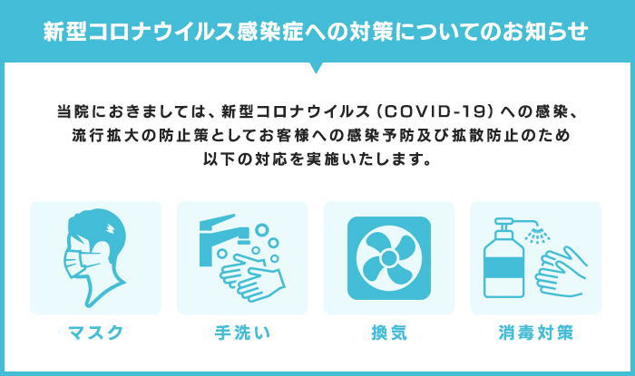 当院では、マスク着用、うがい、手洗い、換気、消毒対策を行っています。